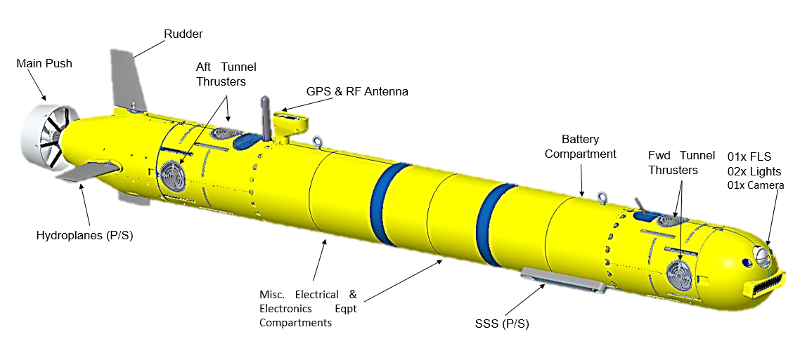 | Sensors | Camera, Lights, Side-Scan & Forward Looking Sonar, Conductivity-Temperature-Depth Sensor (CTD), Water Ingress Sensor, Temperature-Humidity & Pressure Sensor |